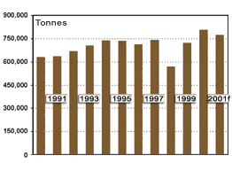 Newsprint prices were strong during the first six months of 2001, peaking at US$625/tonne. Weaker markets, however, in the second half resulted in price declines. Currently, newsprint is trading at US$540/tonne, and is expected to remain in this range through the first three quarters of 2002. The value of newsprint shipments this year is expected to increase marginally to about $690 million.